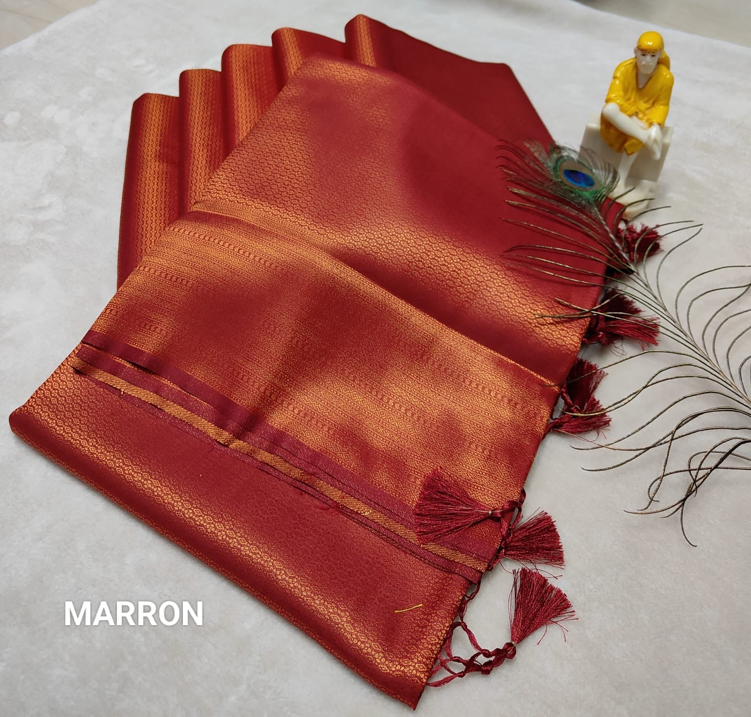 Experience the rich elegance and luxurious feel of our Soft Silk Saree! With a beautiful Copper Zari border and grand pallu, this saree elevates your style effortlessly. Available in multiple colors, this saree promises a rich look for any occasion. Treat yourself to the ultimate saree experience!