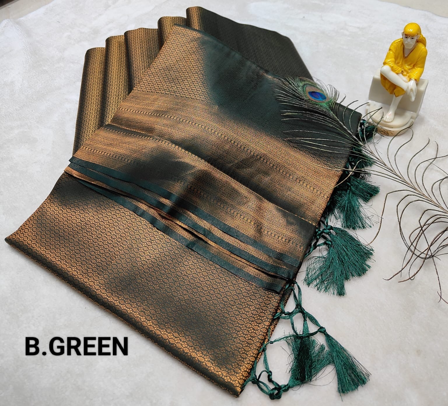 Experience the rich elegance and luxurious feel of our Soft Silk Saree! With a beautiful Copper Zari border and grand pallu, this saree elevates your style effortlessly. Available in multiple colors, this saree promises a rich look for any occasion. Treat yourself to the ultimate saree experience!